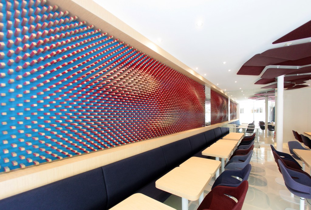 Au cœur de l’espace se trouve un mur d’art paramétrique saisissant, une création unique inspirée de l’art cinétique. Composée de bâtons colorés à deux côtés disposés dans une formation fluide et dynamique, l’installation prend vie grâce à une conception numérique précise. Leur orientation et leur taille sont méticuleusement élaborées, transformant un dégradé noir et blanc en un rythme visuel captivant.