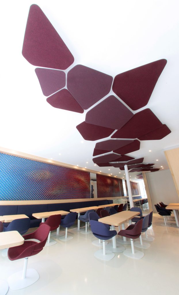 Le restaurant présente un fond à dominante blanche, permettant aux éléments personnalisés dans des tons de violet et de bleu de se démarquer. L’intérieur riche en sens combine la chaleur du bois avec la texture douce des tissus Kvadrat, créant une ambiance à la fois accueillante et sophistiquée.
